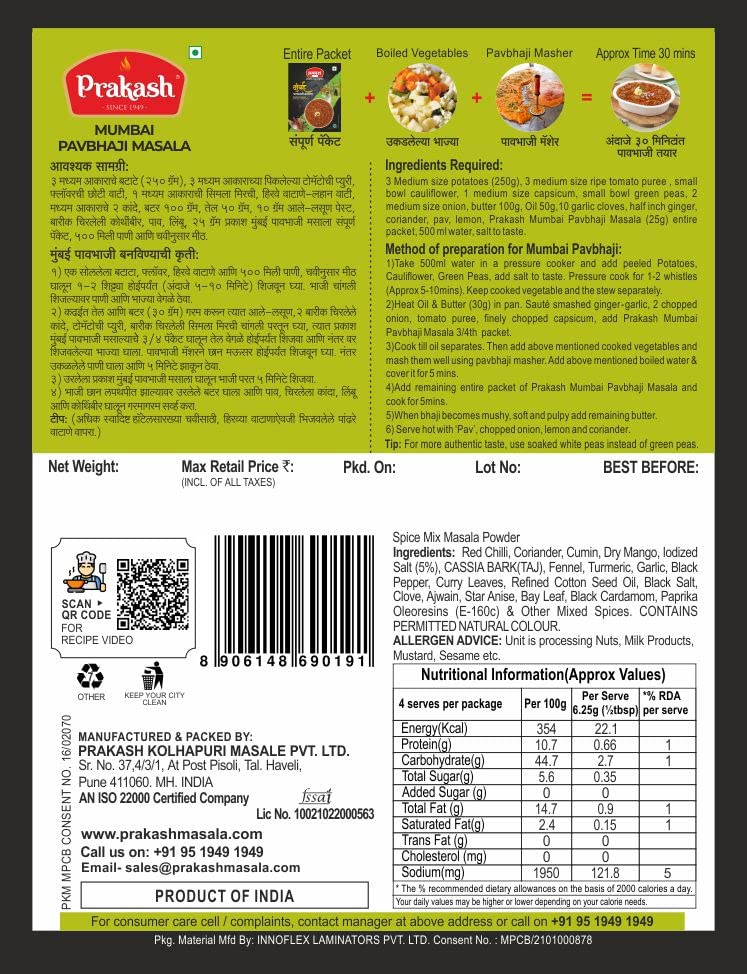 Prakash Mumbai Pav bhaji Masala | Pack of 4 | Ready to Use Mumbai Pav bhaji Masala | Easy to cook | Authentic Maharashtra Spices | Serves 4 (Per Pack) | No Preservatives Colours or Artificial Flavours
