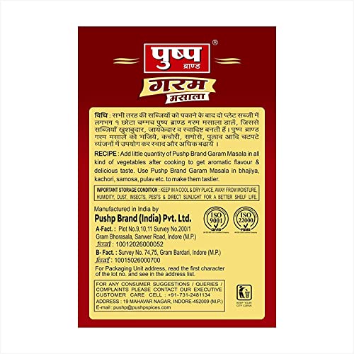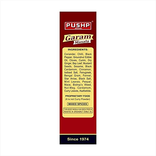 PRODUCT FEATURES:- No flavoring agents. With no artificial taste enhancers. Completely fresh and natural spices Symbolizes Indian culinary tradition Boost body metabolism Adds tremendous flavor to any curry PRODUCT HIGHLIGHTS:- Ingredients:-Coriander Cloves Black Pepper Cumin Dry Ginger Bay Leaf Sesame Mustard Seeds Black Cardamom Cinnamon Peepal Mint Leaves Star anise Mace Bishop's Weed Nut Meg Cardamom Chilli Salt Curry Leaves and Kasoori Methi. Rich in taste:-It is the perfect blend of whole spices and the specialty of north Indian food. It enhances the taste buds with its highly aromatic flavors. Preserve aromas:- The aromas of the Pushp Punjabi garam masala bring you back to your dadi's home. It is one of the most affluent places where you enjoyed the taste of the meal and could not forget the taste. Premium quality:- We grind all the ingredients at low temperatures to preserve the richness of taste and flavor. Easy to cook:- Pushp Punjabi garam masala incorporates all the ingredients in the right proportion that makes your meals interesting. Therefore you do not need to add extra spices and grind them. Important note:- Store the Pushp Punjabi garam masala in a dry and cool place. Keep the masala away from small children.