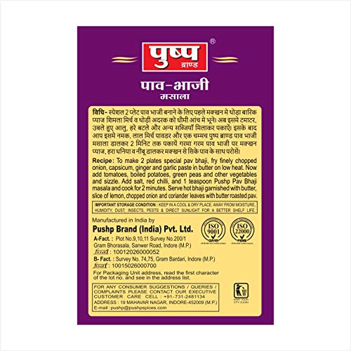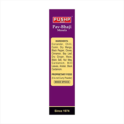 PRODUCT FEATURES:- Retain original aroma. Unique discernible flavour. A lively mix of spice and condiments. Easy to prepare and save time. Make your food more appealing and palatable. PRODUCT HIGHLIGHTS:-Cook intelligent:- Pushp pav bhaji masala is a perfect blend of all the aromatic and highly flavoured spices that will give you the Ultimate mouth-watering experience. Aroma locked:- The secret behind the fantastic taste and flavour of Pushp pav bhaji masala is the low-temperature grinding method. When the Indian spices grind at a low temperature it will ensure the preservation of volatile oils. Satisfy your food cravings:- Making your food exciting and tempting is now no hard nut to crack. You can easily give the perfect flavour and taste to your homemade food and feel your family in the restaurant's environment. Full of nutrition:- Pushp pav bhaji masala gives you an excellent taste and is full of nutrition. The product is full of proteins and rich and dietary fibre along with a mind-blowing taste. Safety information:- *Store it in a dry and cool place.