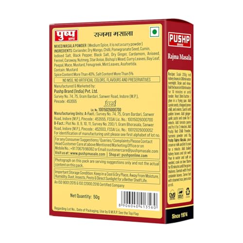Turn your everyday rajma into a restaurant-style delight with Pushp Rajma Masala. Expertly crafted from a blend of over 25 hand-picked spices this masala elevates the humble kidney bean curry into a richly aromatic and flavorful experience. Whether you're cooking for your family or entertaining guests this 50g pack delivers the perfect balance of taste and tradition without any artificial additives. Ideal for North Indian rajma curry preparations it blends seamlessly with your ingredients to offer a wholesome and satisfying taste.