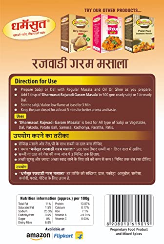 • Dharmasut Rajwadi Garam Masala is best for all type of Sabji or Vegetable Dal Pakoda Potato Ball Samosa Kachoriya Paratha and Patis.