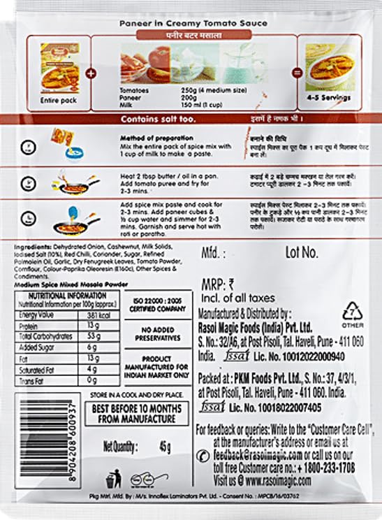 • Convenient: This 45gm pack makes it easy to prepare delicious Paneer Butter Masala at home with minimal effort.