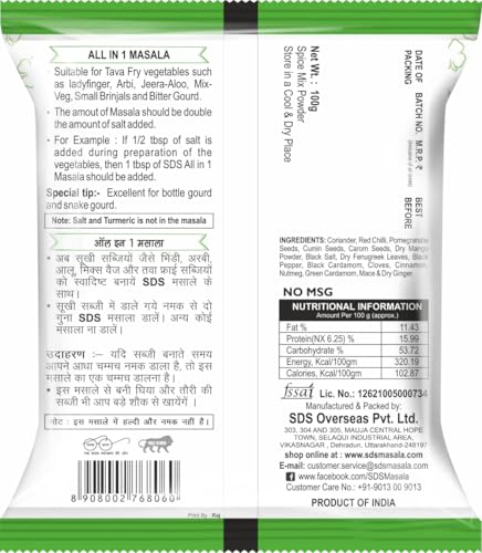 POTENTIAL TO ENHANCE: SDS All-in-One Sabzi Masala contains a mix of spices carefully chosen to enhance various dishes. These spices might also offer potential health benefits. Enjoy the elevated taste and the possibility of well-being in every dish.