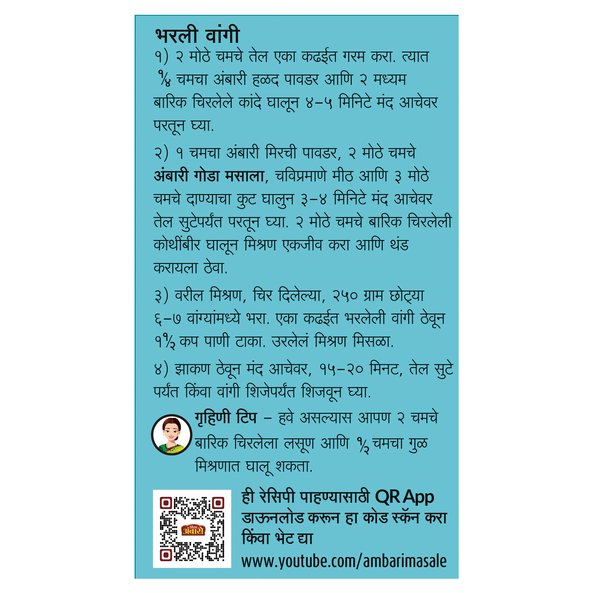 Used for making Bharli Vangi (stuffed brinjals) masale bhaat tondli bhaat (spiced ivy gourd rice) Dal Amti (Maharashtrian dal made from pigeon pea lentils) matki usal bharli bhendi & katachi amti (gravy served with puran poli etc.)