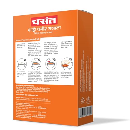 royal flavors of North Indian cuisine with VASANT Shahi Paneer Masala a specially curated blend of premium spices that brings the authentic taste of Mughlai dishes to your kitchen. This pack of 3 sachets of 100g each offering just the right quantity for multiple uses while preserving freshness in every use. Expertly blended with handpicked spices like cardamom cinnamon black pepper and dried herbs this masala is perfect for preparing creamy and flavorful shahi paneer paneer tikka masala mughlai curries and more. The fine balance of rich aroma deep color and smooth taste makes it an ideal choice for both home cooks and professional chefs. What sets VASANT Shahi Paneer Masala apart is its purity and authenticity. It is free from added colors artificial flavors and harmful chemicals ensuring a wholesome and natural taste experience. Every batch is processed under strict hygienic conditions using modern techniques while keeping traditional recipes intact. This masala not only enhances your paneer dishes but can also be used in gravies for kofta mixed veg curry or even non-vegetarian dishes like butter chicken for a restaurant-style finish. Simply sauté it with onions and tomatoes or mix it with cream to create a luscious royal gravy.