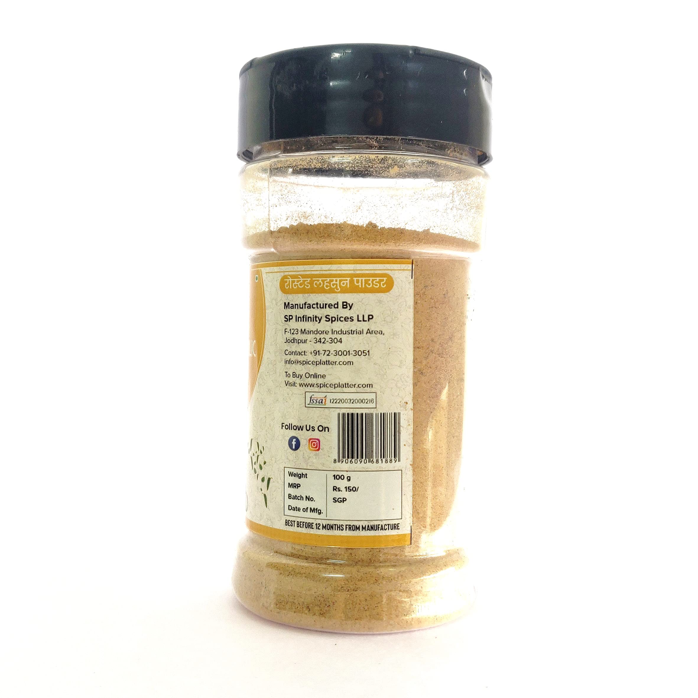 Having Roasted Garlic Powder in a kitchen cabinet can be very useful as it is a quick way to add lots of flavours to a dish. Spice Platter Roasted Garlic Powder is made by dehydrating roasting and grinding fresh & handpicked garlic cloves. Say Bye! to the hassle of peeling & chopping garlic cloves and substitute it with Spice Platter Garlic Powder! A quick way to add lots of flavours to any dish. Garlic Powder is more concentrated than fresh garlic cloves. Being Roasted it can be used as a seasoning on pizza pasta & sandwiches to add zing of garlic. No raw taste of garlic only convenient blast of flavours Ideal for flavouring to dishes in marinades and salad dressings