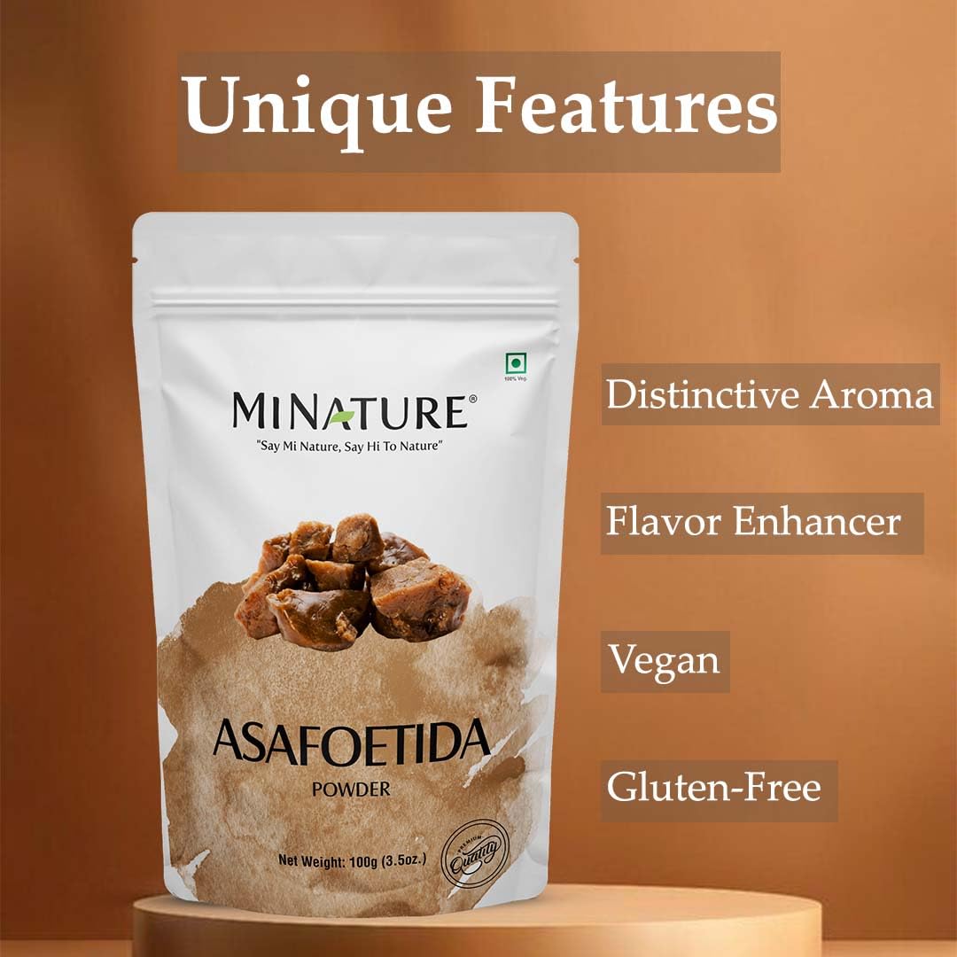 Asafoetida Powder (Hing) by mi nature-100g Asafoetida Powder (Hing) by Mi Nature is a natural high-quality spice derived from the resin of the Ferula plant. This spice is commonly used in Indian cooking and has a unique strong aromatic flavor that enhances the taste of dishes. Asafoetida also known as Hing or Heeng is valued not only for its culinary uses but also for its numerous health benefits. Key Features: 1. Pure & Natural: Made from premium-quality Asafoetida ensuring authenticity and rich aroma. 2. Strong Aromatic Spice: Perfect for enhancing the flavor of traditional Indian dishes like dal curries and sambar. 3. Digestive Support: Known for its traditional use in relieving bloating and supporting healthy digestion. 4. Chemical-Free: No preservatives or artificial additives ensuring safe consumption. 5. Gluten-Free: Suitable for those with gluten sensitivities. 6. Versatile Culinary Use: Ideal for vegetarian and vegan recipes bringing depth to your dishesBenefits of Asafoetida Powder: Adds a distinct umami flavor to dishes. Supports gut health with its carminative properties. Enhances food aroma for a delightful cooking experience. How to Use 1. For Cooking: Use a pinch of hing in hot oil or ghee to release its aromatic essence before adding other ingredients. 2. In Recipes: Sprinkle a small amount in lentil soups curries or pickles for an enhanced flavor. 3. As a Digestive Aid: Blend with water or buttermilk to soothe the stomach after meals.