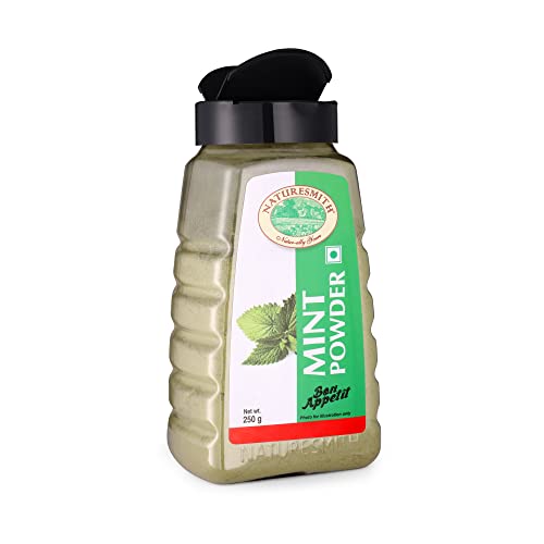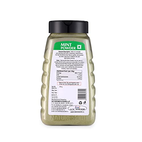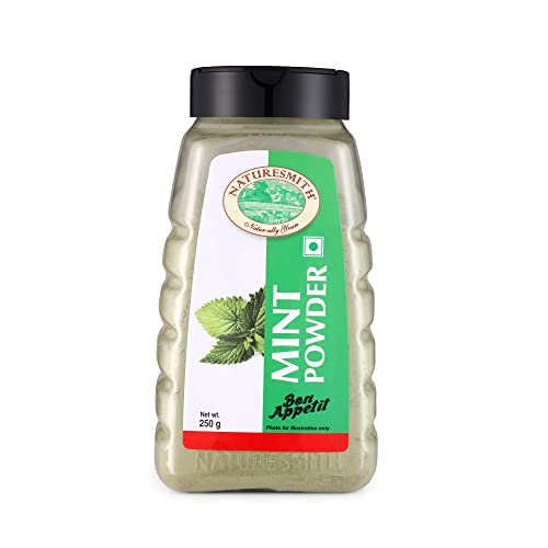 Naturesmith Brand - Mint powder. It's a spice mix that's bursting with flavor. This brand provides enhance the flavor of taste. It is used in a few dishes like mint-coriander chutney rasam sambhar meat fish poultry items and biryanis. Mint tea with mint powder is also popular. Dried Mint powder should be stored in an airtight container placed in a cool dark dry place. Mint powders are considered an aid to the digestive system. A powder made by drying the fresh mint leaves is called mint powder or dried mint. It is used mostly in Indian cuisine to flavor the dishes. Properly stored dried mint flakes will generally stay at their best quality for about 1 to 3 years. To maximize the shelf life of dried mint flakes purchased in bulk and to better retain flavor and potency store in a container with tight-fitting lids. It is used in chutney and pesto too. Try adding mint leaves to curries casseroles and stews or using them as a rub for racks of lamb. You can enjoy dried mint powder over soups salads cooked vegetables fresh fruit or yogurt