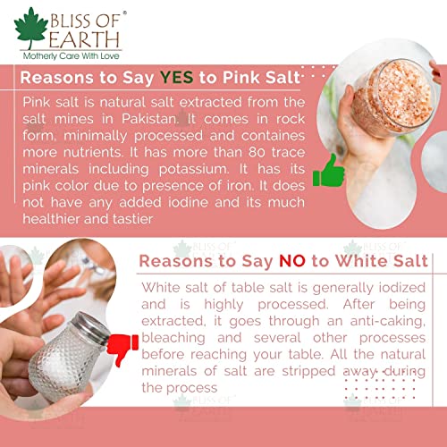 • 100% PURE PAKISTAN ORIGIN: Bliss of Earth Himalayan Pink Salt is Non-GMO and does not contain any MSG gluten or anti-cacking agents. It is sourced from the Himalayan Range of Punjab region in Pakistan.