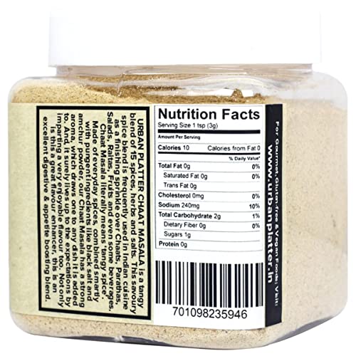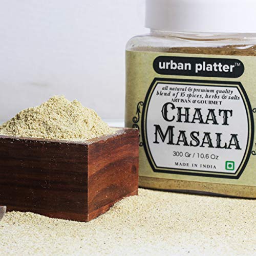 chaat masala 300g [all natural and blend of 15 spices herbs and salts] chaat masala literally means 'tangy spice'. It is tangy blend of 15 spices herbs and salts. Contains amchoor iodized salt black salt pomegranate seed powder cumin ginger black pepper coriander seeds chilly ajwain kachini nutmeg cloves hing and mint leaf powder. This savoury spice blend is frequently used in indian cuisine as a finishing sprinkle over chaats parathas salads raitas fruits and even some beverages. Made of everyday spices combined smartly with pungent ingredients like black salt and amchur powder. Our chaat masala has a strong aroma which draws one to any dish it is ed to. Not only is this a great flavour enhancer this is an excellent and appetite ing blend. - simply good food