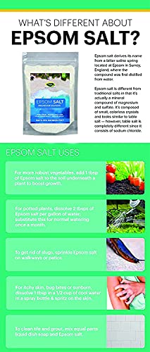 Epsom salt Product Highlight Epsom salt actually magnesium sulfate helps seeds germinate makes plants grow bushier produces more flowers increases chlorophyll production and deters pests such as slugs and voles. It also provides vital nutrients to supplement your regular fertilizer. Uses Houseplants: 2 tablespoons per gallon of water; feed plants monthly. Roses: 1 tablespoon per foot of plant height per plant; apply every two weeks. Lawns: Dissolve 20g of Magnesium Sulphate in a litre of water and apply at a rate of 1 litre and spray Trees: Apply 2 tablespoons per 9 square feet. Apply over the root zone 3 times annually. Garden Startup: Sprinkle 1 cup per 100 square feet. Mix into soil before planting. Note: There might be slight variations in product due to product and packaging enhancements. However the product efficacy remains unchanged.