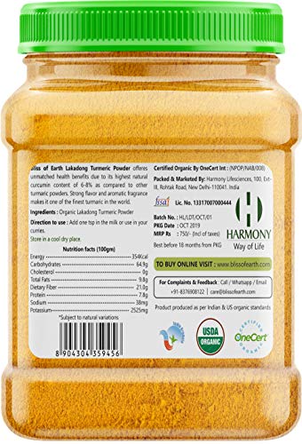 Bliss of Earth Organic Lakadong Turmeric Powder Bliss of Earth Lakadong Turmeric Powder is an organic versatile herb known for centuries for its health benefits. It offers an unmatched health benefits due to its highest natural curcumin content of 6-8% as compared to other turmeric powders. Grown in the hills of the Lakadong Village in Meghalaya Iindia this turmeric powder not only has a rich colour but also an intense flavour. It also has an aromatic fragrance that shows well when used in curries. Its natural flavor makes a perfect addition to your favourite curries vegetables or milk.