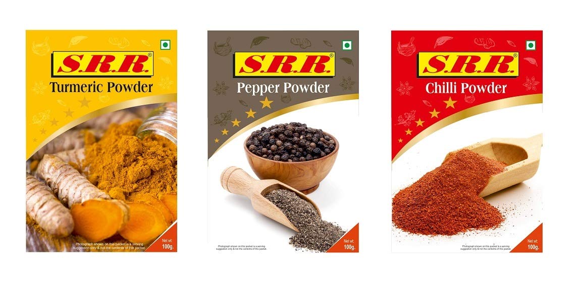 SRR Masala Turmeric Haldi Powder Black Pepper and Chilli Powder Pack of 3 Combo 100 Grams Each