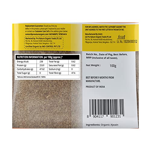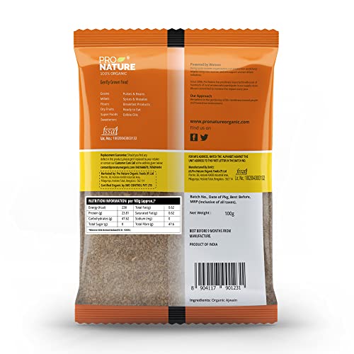 Pro Nature 100 per cent Organic Ajwain has an authentic taste and aroma sourced from where it is best grown. The uniqueness of our Ajwain lies in the seed size authentic taste and strong aroma. We take utmost care in packing and storing of all our products. Pro Nature Organic Ajwain offers you a high quality spice with numerous health benefits. Since ancient times ajwain is used as a medicinal ingredient in ayurveda. Aromatic spice adds delightful exotic flavor to a variety of dishes and Pro Nature Organic Ajwain delivers to you just that by making it available for all age groups.