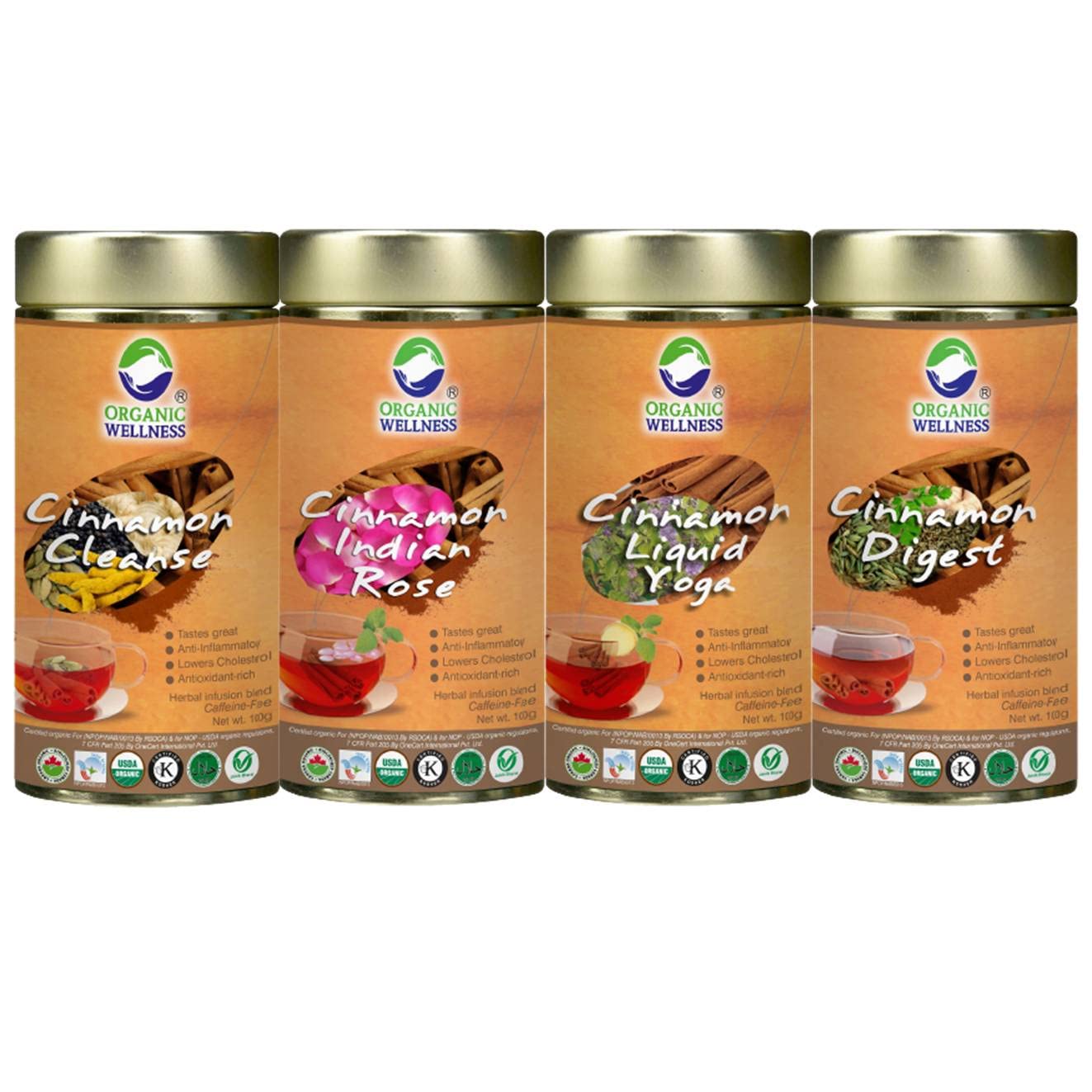 Organic Wellness has 4 rich cinnamon blends; cinnamon cleanse cinnamon digest cinnamon Indian rose and cinnamon liquid yoga. Cinnamon cleanse is a sweet smelling mix of cinnamon cardamom black pepper ginger and turmeric. Cinnamon digest is a unique mixture of of cinnamon bark cumin seeds coriander powder ginger and carom seeds (ajwain). cinnamon Indian rose is a refreshing blend of aromatic cinnamon tulsi bay leaves cardamom chamomile peppermint and fragrant Indian rose. Cinnamon liquid yoga is a blend of cinnamon tulsi and peppermint.