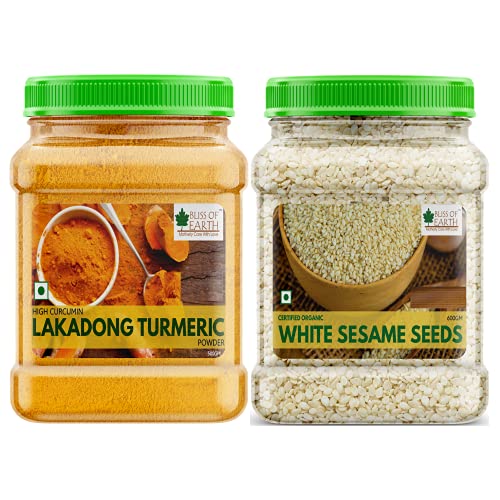 Bliss of Earth Organic Lakadong Turmeric Powder Bliss of Earth Lakadong Turmeric Powder is an organic versatile herb known for centuries for its health benefits. It offers an unmatched health benefits due to its highest natural curcumin content of 6-8% as compared to other turmeric powders. Grown in the hills of the Lakadong Village in Meghalaya Iindia this turmeric powder not only has a rich colour but also an intense flavour. It also has an aromatic fragrance that shows well when used in curries. Its natural flavor makes a perfect addition to your favourite curries vegetables or milk. Bliss of Earth White Sesame seed are dehulled and are an excellent source of coppercalciumomega fatty acidsiron magnesiumphosphorus zinc and selenium. Sesame seeds are also a good source of fiber with a rich nutty flavour. Called the queen of oil seeds these tiny seeds are a go to topping on breadstick and burger buns.