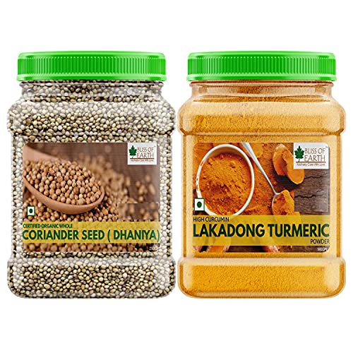 Bliss of Earth Organic Lakadong Turmeric Powder Bliss of Earth Lakadong Turmeric Powder is an organic versatile herb known for centuries for its health benefits. It offers an unmatched health benefits due to its highest natural curcumin content of 6-8% as compared to other turmeric powders. Grown in the hills of the Lakadong Village in Meghalaya Iindia this turmeric powder not only has a rich colour but also an intense flavour. It also has an aromatic fragrance that shows well when used in curries. Its natural flavor makes a perfect addition to your favourite curries vegetables or milk. The nutritional value of coriander seeds is without doubt mind-blowing. It contains 11 different types of essential mineral oils and vitamins Dhania seeds are also used as a spice in indian chinese pakistani european and middle-east culinary preparations. In north india dhania powder is widely used for spicing pickles chutneys stews marinades sausages and curries.