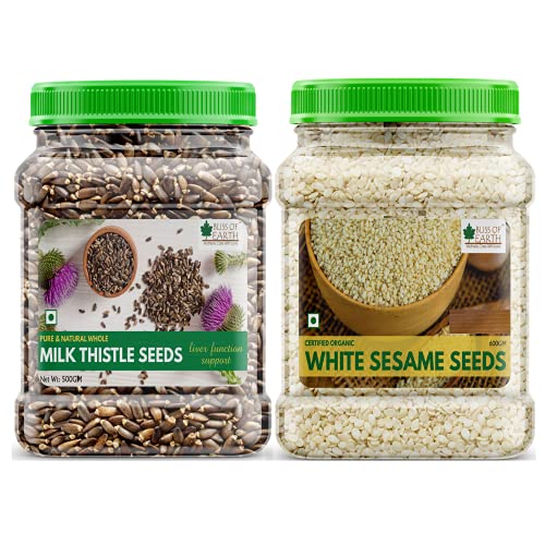 Bliss of Earth Milk thistle seeds are used as herbal remedy derived from the milk thistle plant also known as Silybum marianum. The active ingredients silymarin extracted from milk thistle is known to have antioxidant antiviral and anti-inflammatory properties. Bliss of Earth Organic White Sesame seeds are dehulled and are excellent source of copper calcium omega fatty acids iron magnesium phosphorus zinc and selenium. Sesame Seeds are also a good source of fiber with a rich nutty flavour. Called the queen of oil seeds these tiny seeds are a go-to topping on breadsticks and burger buns. Ingredients: Organic Sesame Seeds