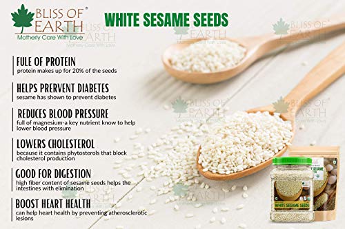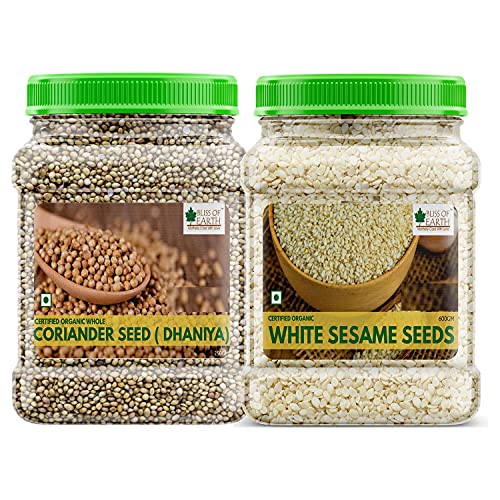 Bliss of Earth Organic White Sesame seeds are dehulled and are excellent source of copper calcium omega fatty acids iron magnesium phosphorus zinc and selenium. Sesame Seeds are also a good source of fiber with a rich nutty flavour. Called the queen of oil seeds these tiny seeds are a go-to topping on breadsticks and burger buns. Ingredients: Organic Sesame Seeds The nutritional value of coriander seeds is without doubt mind-blowing. It contains 11 different types of essential mineral oils and vitamins Dhania seeds are also used as a spice in indian chinese pakistani european and middle-east culinary preparations. In north india dhania powder is widely used for spicing pickles chutneys stews marinades sausages and curries.