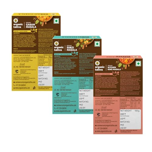 Organic Tattva Organic Every Kitchen Use Masala Combo is a pack of three useful authentic and aromatic masala blends this pack contains : 1. Organic Kitchen King Masala 2. Organic Sabzi /Sabji Masala 3. Organic Garam Masala