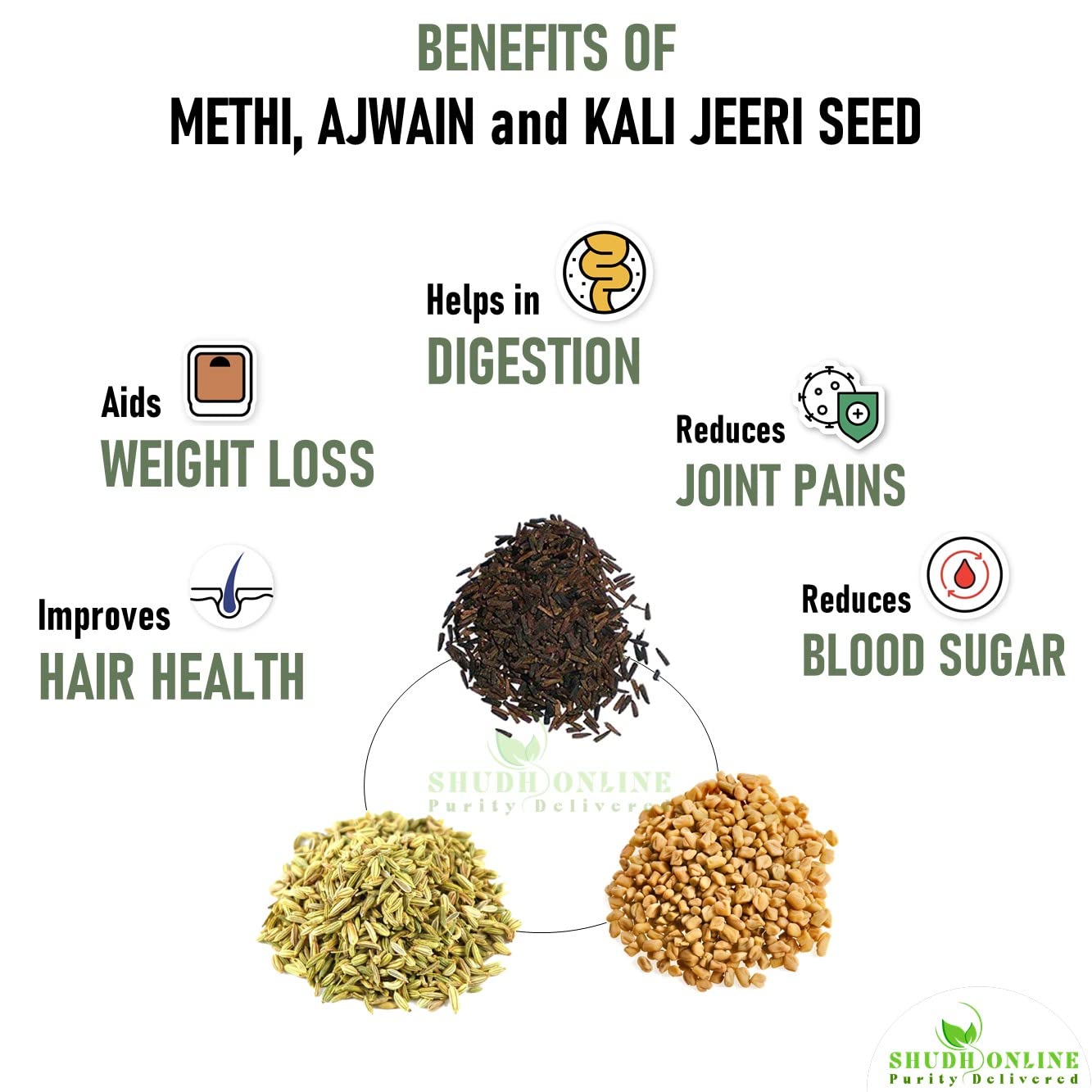 Shudh Online Methi Kali Jeeri Ajwain is a magical blend of kali jeeeri methi and ajwain seeds naturally loaded with nutrients and antithat health and s and longevity. Methi is also known as methi seeds fenugreek seeds methi dana methidana fenugreek seed powder menthi powder fenu fiber fungreek meethi seeds Kasoori methi Kaaindha vendhaya ilaigal Menthiyam Vendhayam Methi ke dane. Ajwain is also known as Carom seed Weed seed Vaamu ajawain ajvaain carrom azwine aijwain ajvayan ajwan ajwine ahwain ajaiwain ajwein ajwaian aajwain ajvain ajawaine ajewain ajwaain. Kali Jeeri is also known as Karbi Jiri Karba Jeera Kaali Jeeri Tikta Jeerak. Shudh Online products are selectively sourced with great emphasis on purity and authenticity and are 100% natural ayurvedic products. We don't add any or additives in the product and using our product will get you closure to nature.