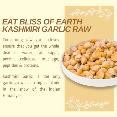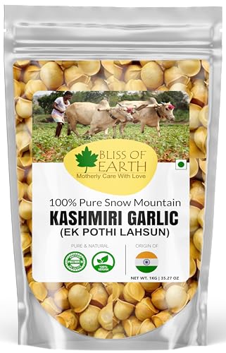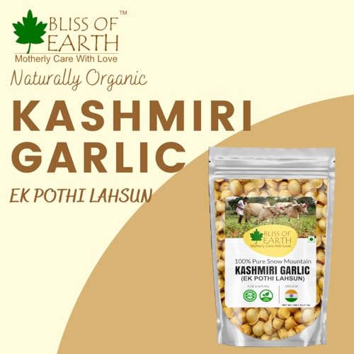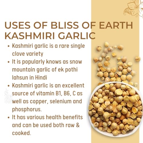 Bliss of Earth Kashmiri Lahsun or kashmiri garlic is a rare single clove varity of allium sativum. It is popolarly knows as snow mountain garlic of ek pothi lahsun in Hindi. Kashmiri garlic is an excellent source of vitamin B1 B6 C as well as copper selenium and phosphorus. It has various health benefits and can be used both raw & cooked. Direction for use: Crush & consume raw daily with water. Use in your cooking recipies. Ingredients: Kashmiri Garlic