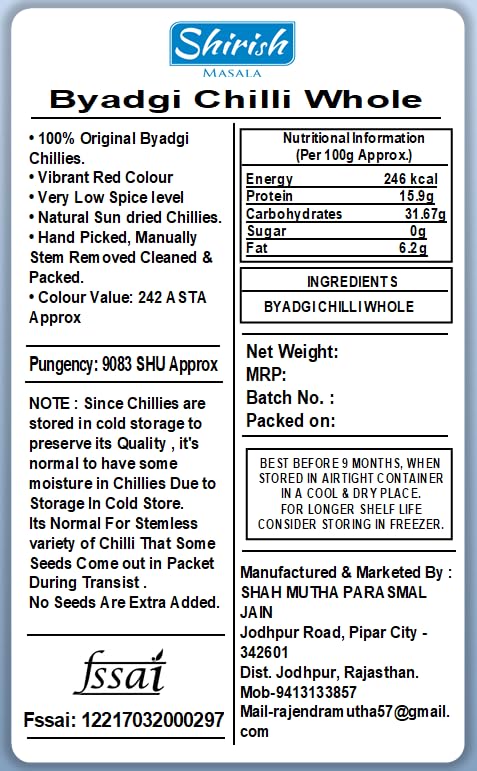 Shirish Masala - Tradition of Purity. ingredients: byadgi chilli wholehand sortex chillies
