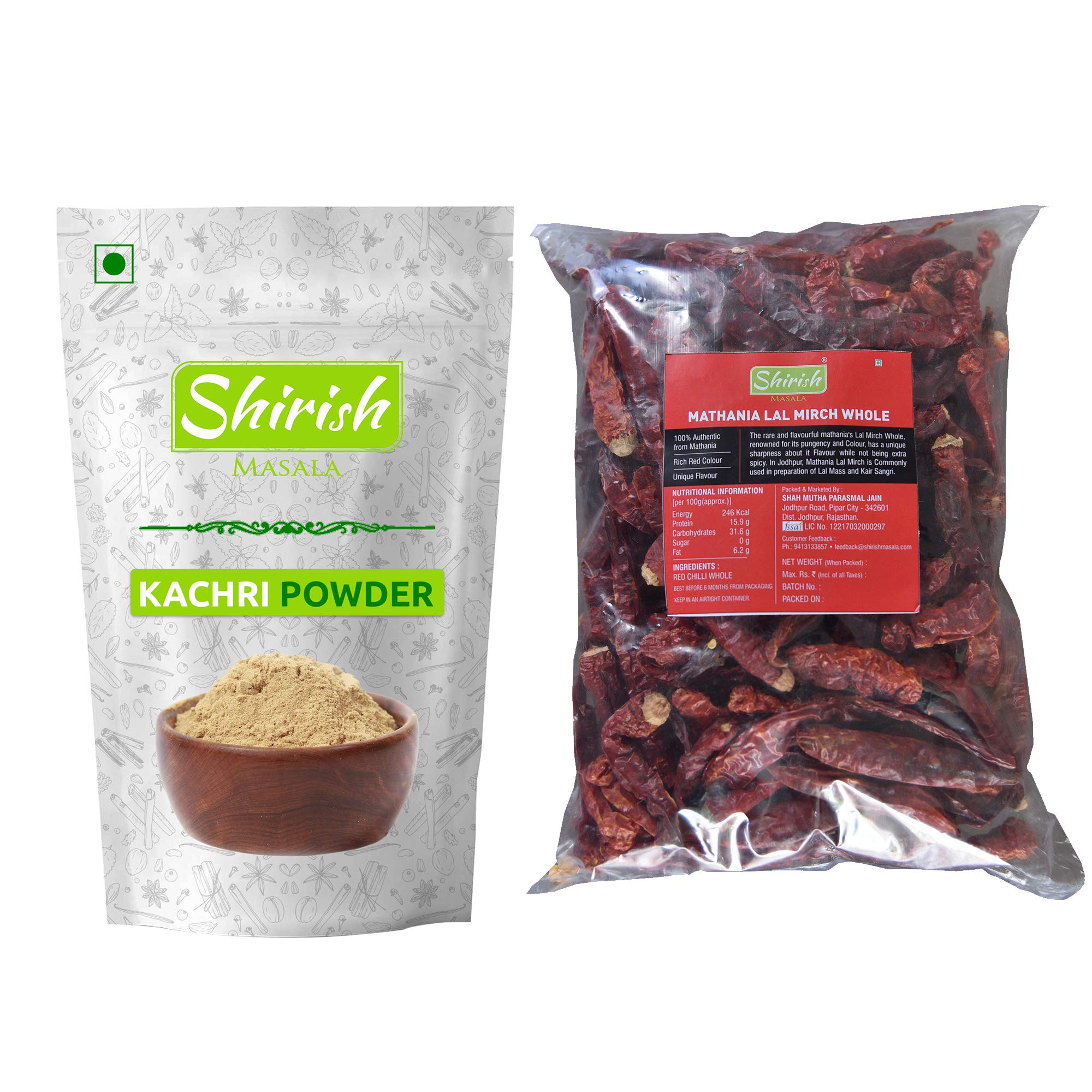 Shirish Masala Combo Pack of Mathania Red Chilli & Kachri Powder.Shirish Masala presents the hidden treasure of Rajasthan - The rare and flavorful Mathania's Lal Mirch Whole also famously known as "Mathania Mirchi". Mathania situated in Jodhpur District is famous for its Red Chillies. These chillies are renowned all over the world for its pungency and colour. A moderate amount of Mathania Mirch can bring out the best flavour in your dish. Although these chillies arent the spiciest they have a unique sharpness and taste. Finest grade Mathania Chillies are carefully hand picked dried and packed in a very hygienic condition to ensure the superior quality. In Jodhpur mathania lal mirch is commonly used in preparation of dishes such as Lal Maas and Kair-Sangri.