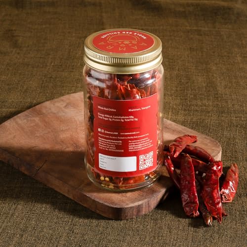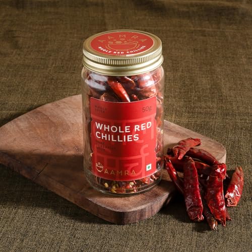 Pure Bold & Hot | Sourced from Khammam Telangana AAMRA's Whole Red Chillies are sun-dried to preserve their natural heat and vibrant color. These versatile chillies add a fiery kick and rich flavor to your dishes. Use them whole for tempering dals and curries or grind them into powder for a homemade spice mix. Perfect for adding heat to your everyday cooking.