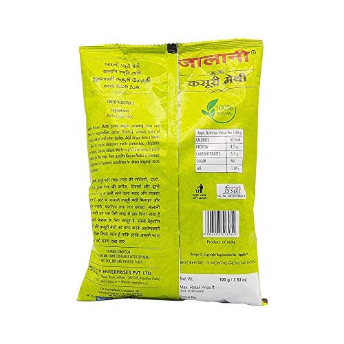 Jalani Kasuri Methi : Dried Methi leaves procured from the places famous for the crop. Best quality Kasuri Methi is cleaned and packed in hygienic condition to retain original taste and aroma. For delicious paratha chapatti naan Puri etc. add Kasuri Methi with flour.