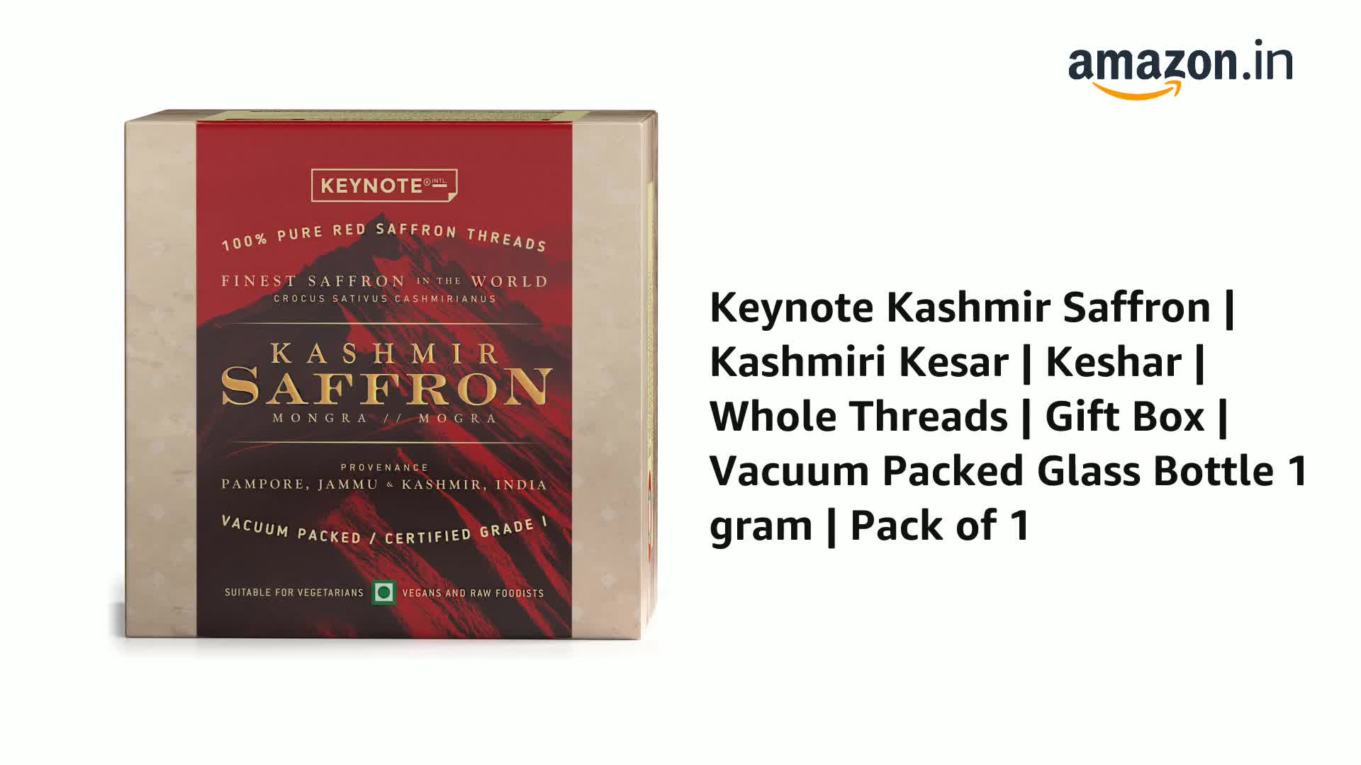 Keynote Kashmir Saffron | Kashmiri Kesar | Keshar | Whole Threads | Gift Box | Vacuum Packed Glass Bottle 1 gram | Pack of 1