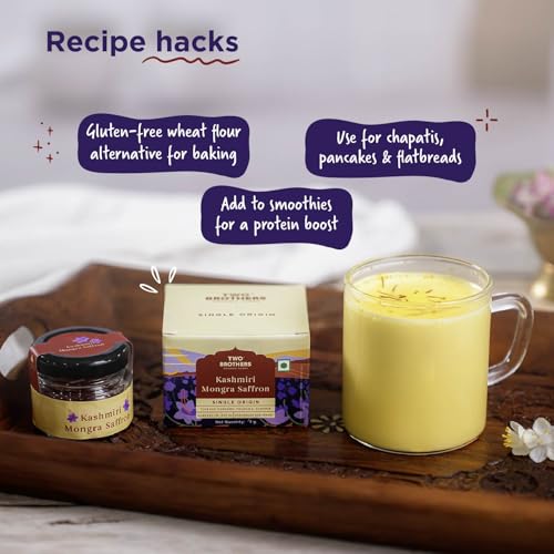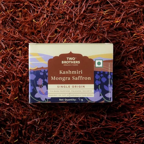 The Two Brothers A++ Kashmiri Mongra Saffron is sourced directly from the lush Saffron fields of Tulbagh Pampore - the Saffron town of India. After the flowers are harvested the purple petals are separated. 6 saffron strands are carefully pulled out using 2-3 fingers comprising both female (3 red strands) and male (3 yellow strands) while ensuring the pedicle is attached to the strands. This is followed by sun-drying for at least 2 days to remove all moisture. Then the strands are again moistened on white woolen cloth so the heavier stronger red strands can be separated from the lighter orange or white parts of the strands. This careful labour intensive manual process makes Saffron the most expensive spice in the world. Our process also ensures the best quality saffron that is highly aromatic and imparts rich colour and strong flavour to dishes. It is best before 12 months from the date of packaging.