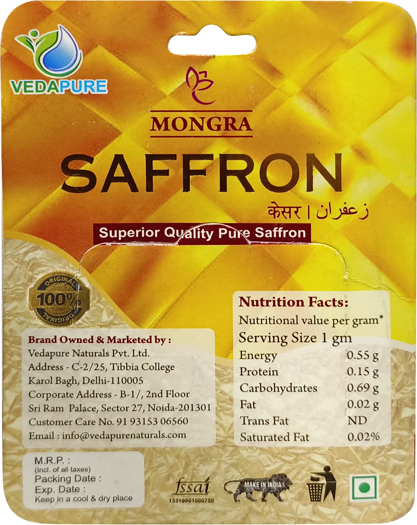• Laboratory Tested: Each batch of Vedapure Mongra Saffron undergoes rigorous testing to ensure it meets strict quality standards. This guarantees that you receive saffron of the highest quality and purity.