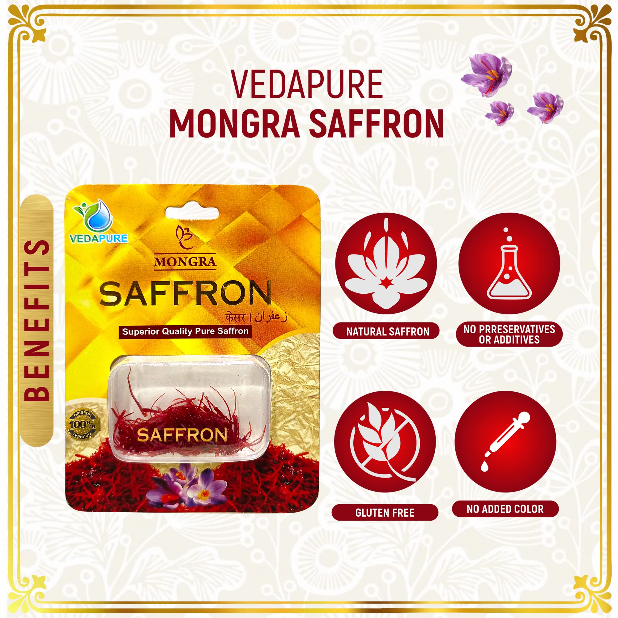 • Health Benefits: Known for its medicinal properties Vedapure Mongra Saffron supports overall health and well-being. It's particularly beneficial for pregnant women helping to promote good health during pregnancy and aiding in maintaining overall wellness.