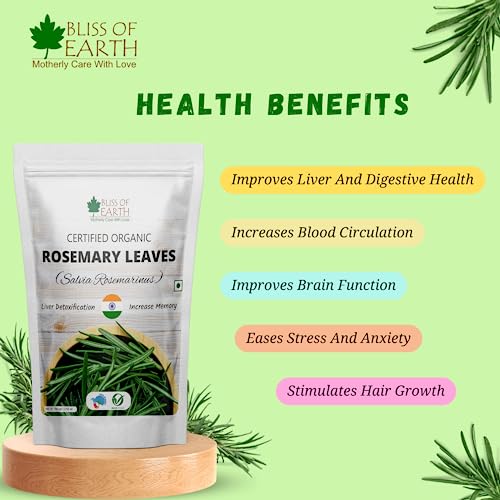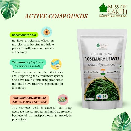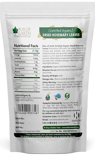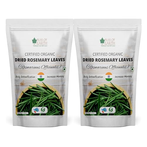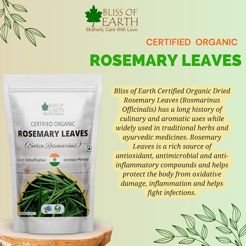 Bliss of Earth Certified Organic Dried Rosemary Leaves (Rosmarinus Officinalis) has a long history of culinary and aromatic uses while widely used in traditional herbs and ayurvedic medicines. Rosemary Leaves is a rich source of antioxidant antimicrobal and anti-inflammaroty compounds and helps protect the body from oxidative damage inflammation and helps fight Problems.