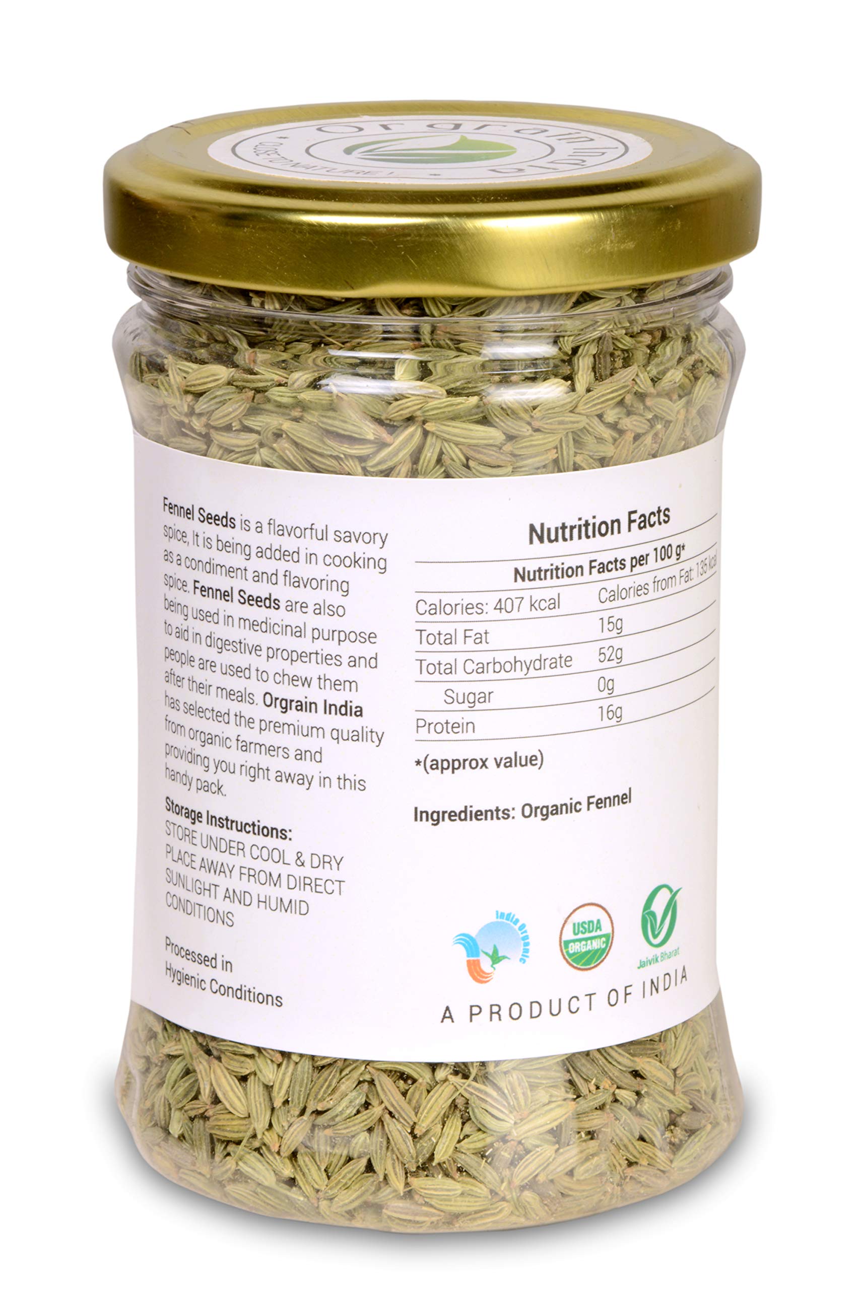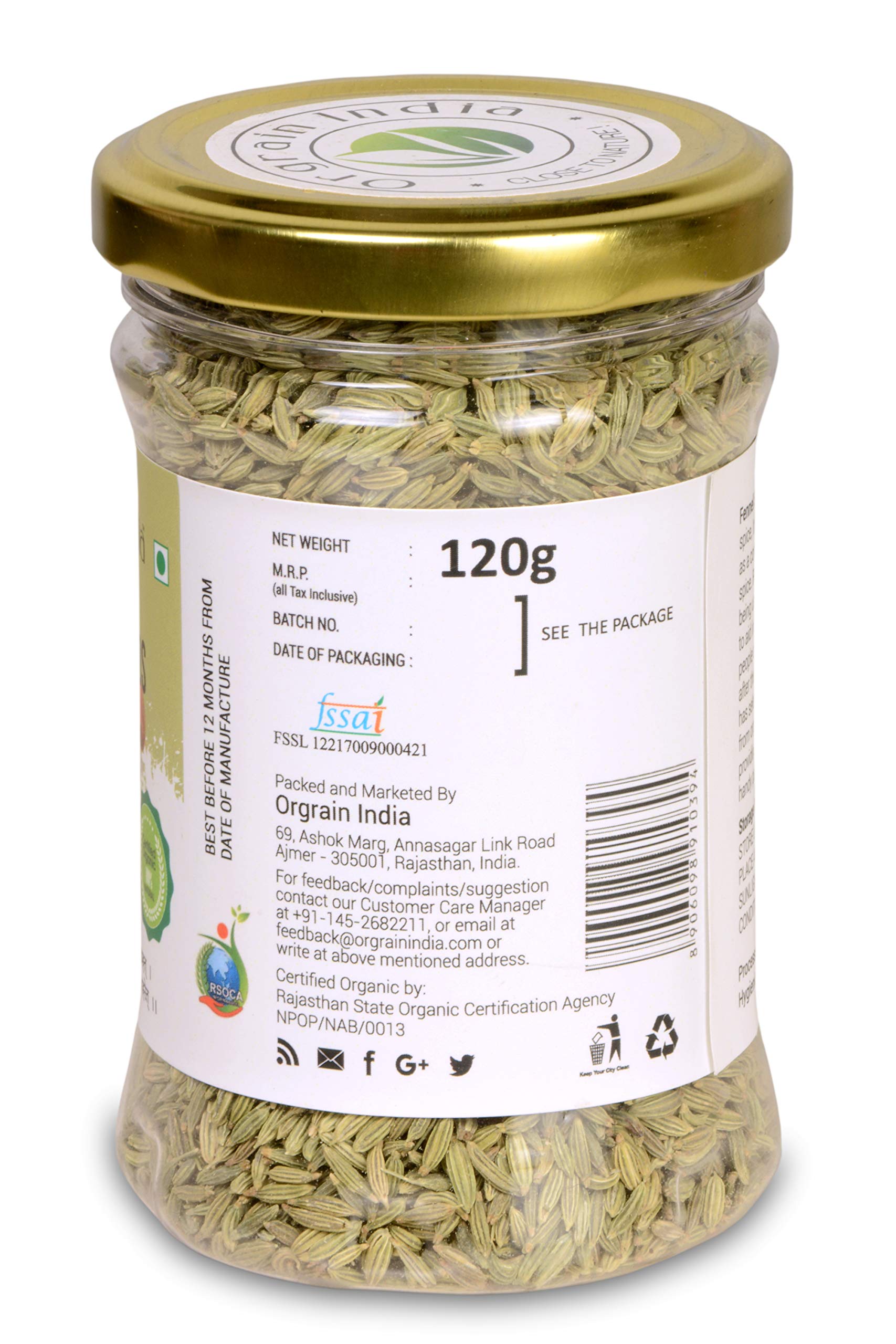 Orgrain India Organic Fennel Seeds 120 grams | Saunf | Variyali | Whole Indian Spices