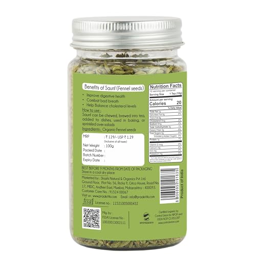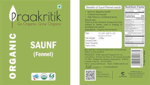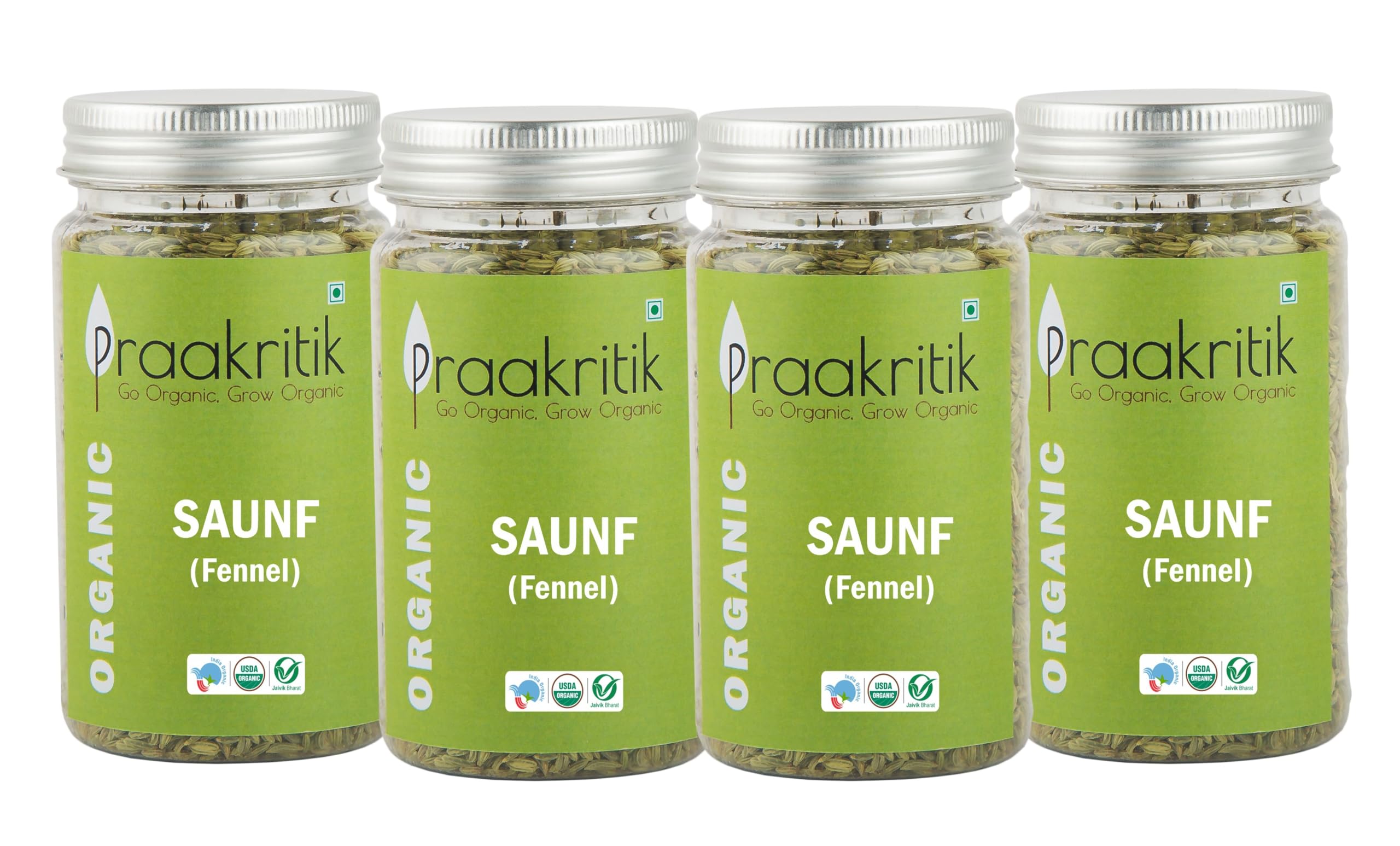 Praakritik Organic Saunf | Organic Fennel Seeds | 100% Natural & Vegetarian | Rich in Vitamin C | Healthy And Energetic | No Added Preservatives & Colors | Pack of 4 | 100 Grams Each