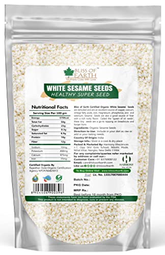 Bliss of Earth Organic White Sesame seeds are dehulled and are excellent source of copper calcium omega fatty acids iron magnesium phosphorus zinc and selenium. Sesame Seeds are also a good source of fiber with a rich nutty flavour. Called the queen of oil seeds these tiny seeds are a go-to topping on breadsticks and burger buns. Ingredients: Organic Sesame Seeds