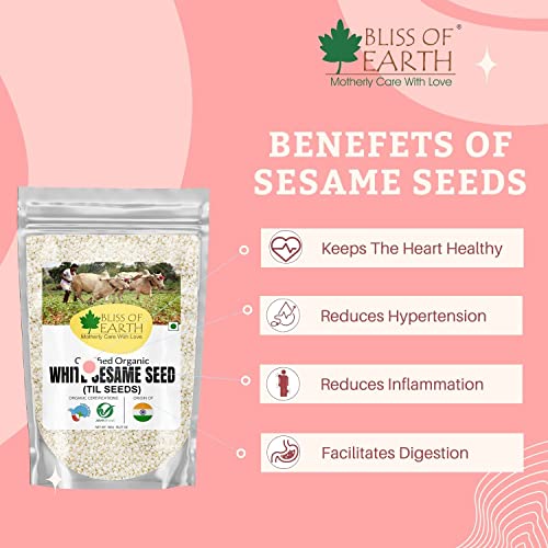 Bliss of Earth Organic White Sesame seeds are dehulled and are excellent source of copper calcium omega fatty acids iron magnesium phosphorus zinc and selenium. Sesame Seeds are also a good source of fiber with a rich nutty flavour. Called the queen of oil seeds these tiny seeds are a go-to topping on breadsticks and burger buns. Ingredients: Organic Sesame Seeds