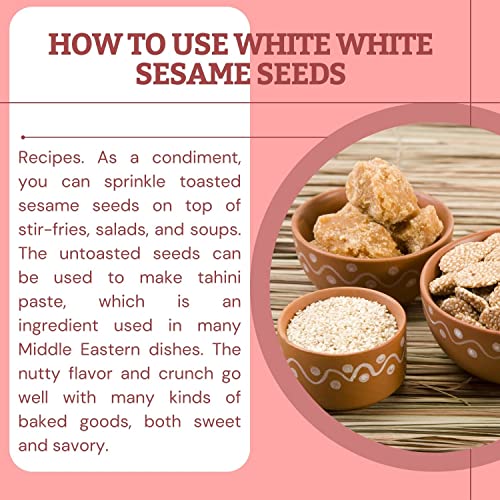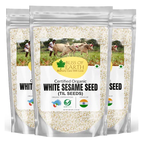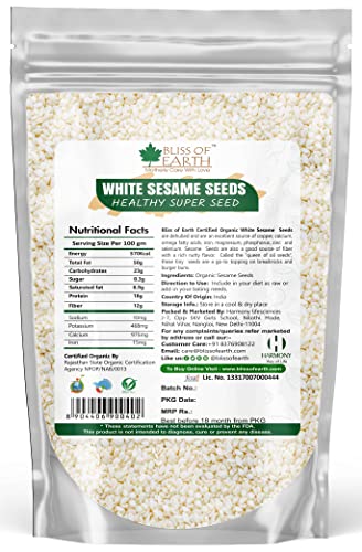 Bliss of Earth Organic White Sesame seeds are dehulled and are excellent source of copper calcium omega fatty acids iron magnesium phosphorus zinc and selenium. Sesame Seeds are also a good source of fiber with a rich nutty flavour. Called the queen of oil seeds these tiny seeds are a go-to topping on breadsticks and burger buns. Ingredients: Organic Sesame Seeds