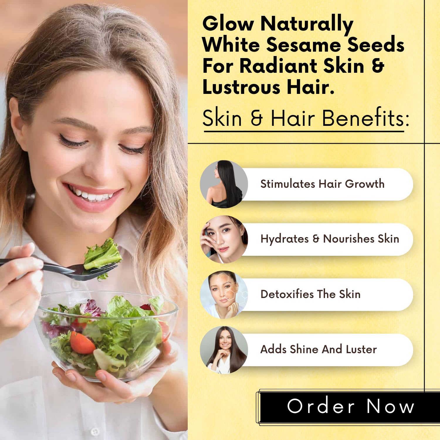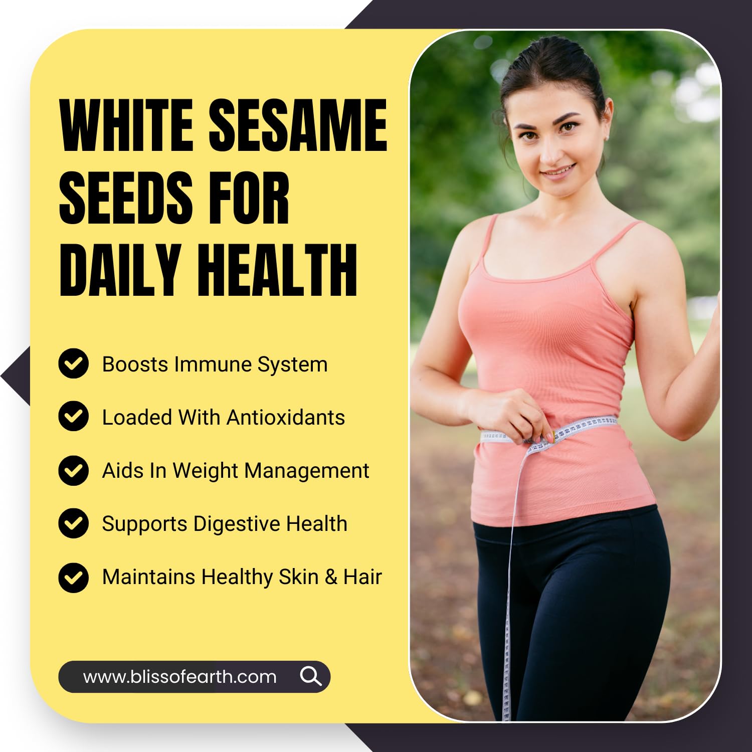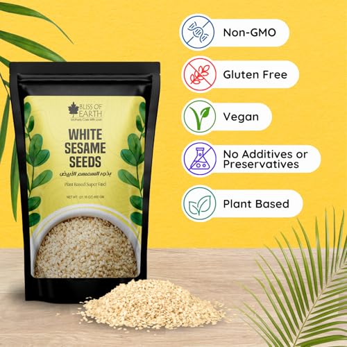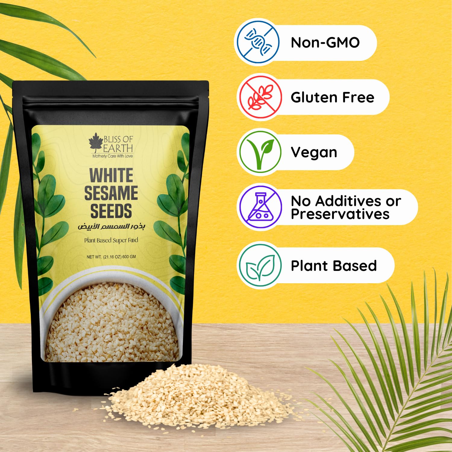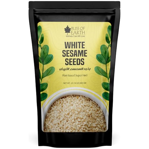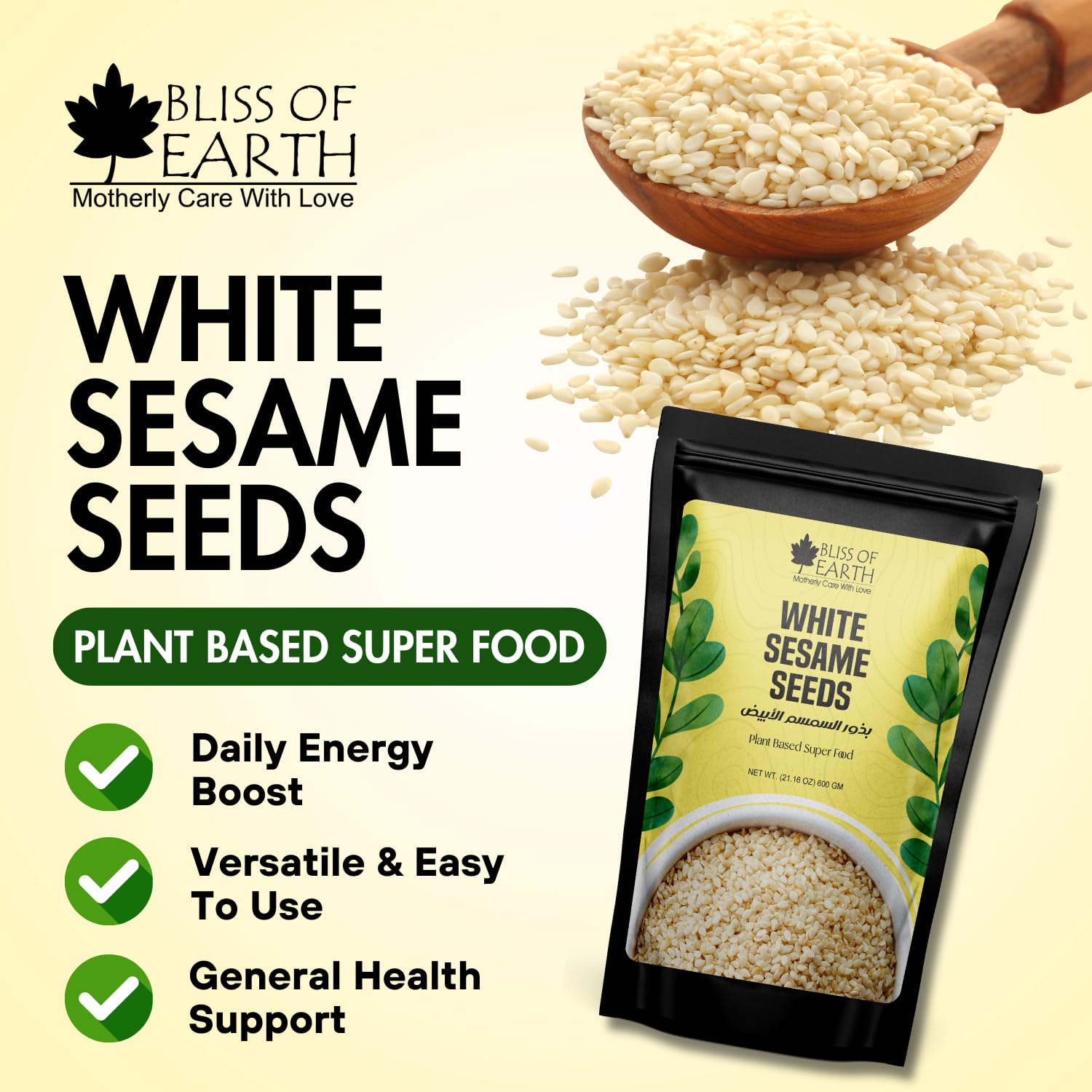 Bliss of Earth Organic White Sesame seeds are dehulled and are excellent source of copper calcium omega fatty acids iron magnesium phosphorus zinc and selenium. Sesame Seeds are also a good source of fiber with a rich nutty flavour. Called the queen of oil seeds these tiny seeds are a go-to topping on breadsticks and burger buns. Ingredients: Organic Sesame Seeds