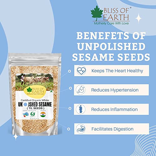 Bliss of Earth Organic Unpolished Sesame seeds are an excellent source of copper calcium omega fatty acids iron magnesium phosphorus zinc and selenium. Sesame Seeds are also a good source of fiber with a rich nutty flavour. Called the queen of oil seeds these tiny seeds are a go-to topping on breadsticks and burger buns. Ingredients: Organic Sesame Seeds