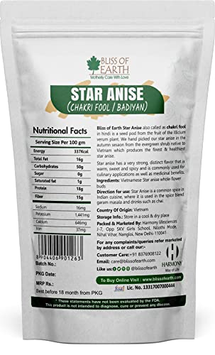 Bliss of Earth Star Anise also called as chakri phool in hindi is a seed pot from the fruit of the illicium verum plant. We hand picked our star anise in the autumn season from the evergreen shrub native to Vietnam which produces the finest & healthiest star anise. star anise has a very strong distinct flavor that is warm sweet and spicy and is commonly used for culinary applications as well as medicinal benefits.