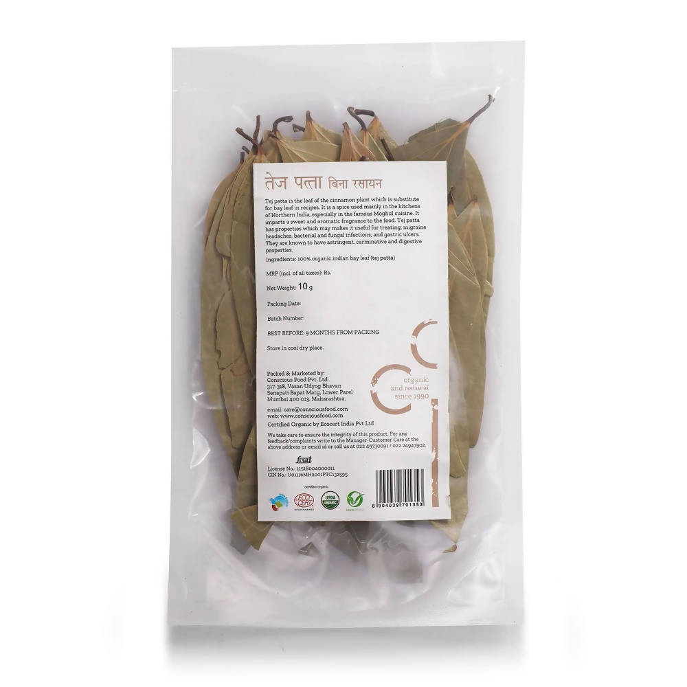 Conscious Food Organic Indian Bay Leaf (Tej Patta)Cinnamon Leaf (Tej Patta) is the leaf of the cinnamon plant often substituted for bay leaf in recipes. It is highly sought after for the rich aromatic flavor that it imparts to dals, pilaf, and curries. Additionally, this humble leaf is one of the healthiest seasonings to have in your pantry.Ingredients:Cinnamon Leaf (Tej Patta)Uses:Adds a rich aromatic flavor to dals and curries.Makes for a great addition to tadka in dals, raita, etc.Legal Disclaimer: Product images are for illustrative purposes only. Images/packaging/ labels may vary from time to time due to changes made by the manufacturer's manufacturing