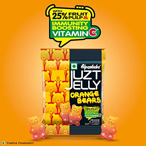 Alpenliebe Juzt Jelly Orange Bears - Family Mein Masti Chali ! Irresistible sugar sanded Bear-shaped jellies in Orange flavour which are best enjoyed by sharing with family and friends. Experience goodness of fruit with 25% Fruit Pulp in the form of tasty & soft jelly! These adorable looking jellies can be consumed by kids and grown-ups alike. Surprise your kids with these attractive jellies by packing some in their tiffin. What's more? Juzt Jellies can be used as ingredient for more interesting and enticing desserts like cakes ice-creams shakes muffins etc.