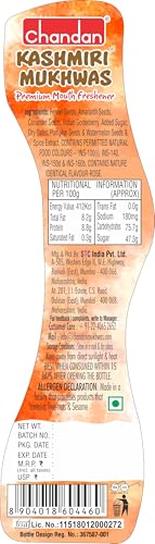 Chandan Kashmiri Mukhwas. An after-meal confectionery and mouth freshener. 100% vegetarian. Chandan Products are made from pure natural and non-toxic ingredients that does not cause any addiction. The colors being used are the extracts from fruits and veg