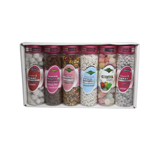 It is a combo of 6 different types flavours of yummy digestives churans and mouth freshener which includes Anardana Goli 110 GM Jeera Goli Special 120g Mitha Pan Chhuhara 90 GM Satrangi Mukhwas 100 GM Madrasi Sonff 100 GM and Cocktail Candy 120 GM. Dilbahar yumy digestive & mouth freshener gift packs are best suit for weddings festival & corporate giftings.