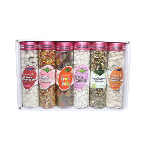 It is a combo of 6 different types flavours of yummy digestives churans and mouth freshener which includes Satrangi Mukhwas 200 GM Fruit Jelly 230 GM Anardana Goli 210 GM Aplam Chaplam 165 GM Silver Softy 200 GM and Royal Rajwadi Mukhwas 210 GM. Dilbahar yumy digestive & mouth freshener gift packs are best suit for weddings festival & corporate giftings.
