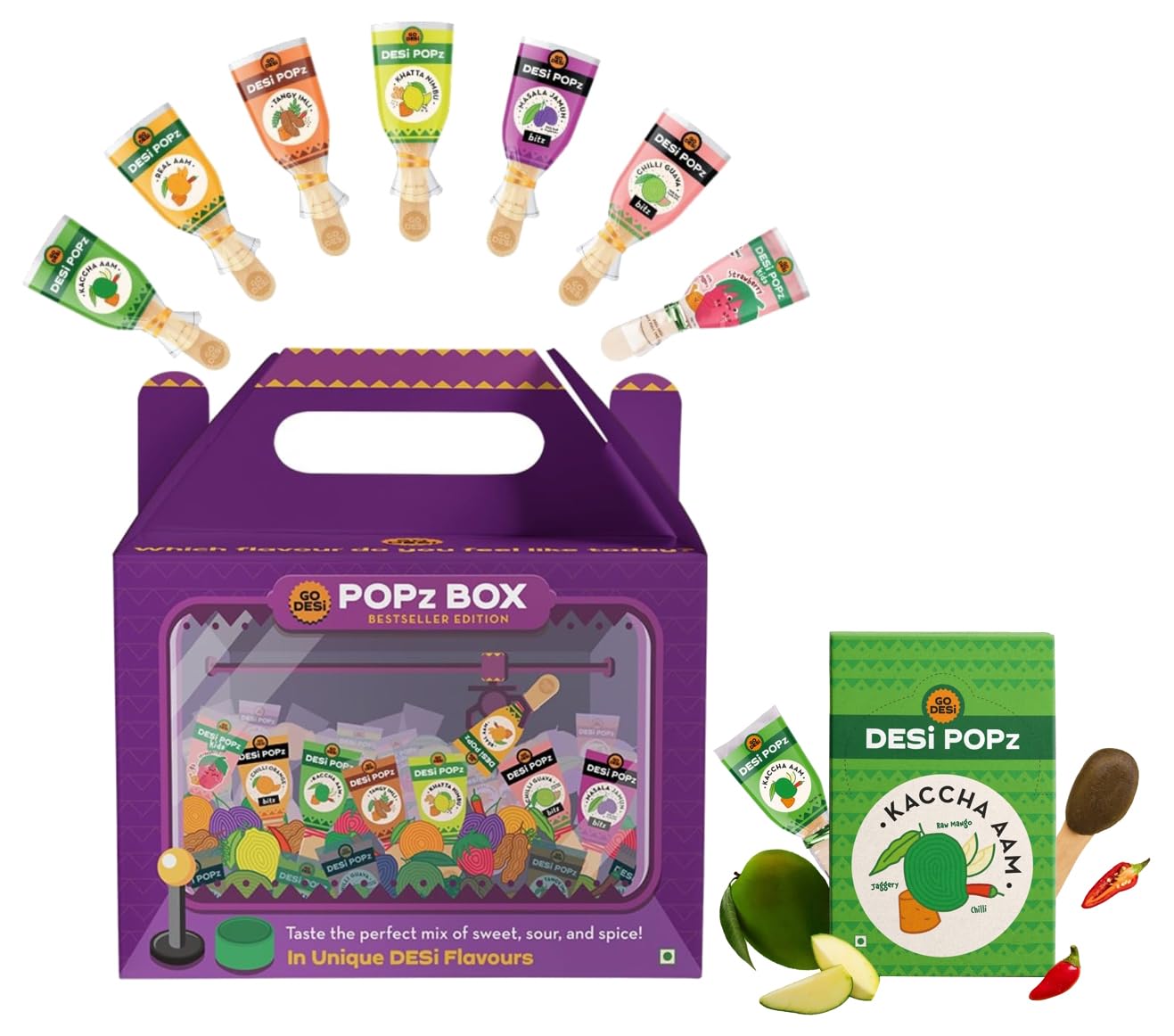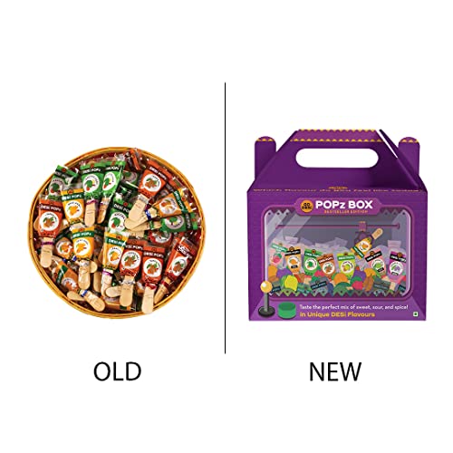 GO DESi - Pops Trial Pack | Gift Box | DESi POPz | Tangy Imli | Kaccha Aam | Real Aam | LollipopThe DESi POPz Gift Basket for the perfect mix of sweet sour and spice. The basket features our best selling POPz in every flavour because one is never enough when it comes to these delectable treats of your childhood. Like all our products the POPz are handmade by rural women following traditional and age old recipes. Featuring some of the choicest ingredients which are 100% organic and farm sourced the POPz are truly irresistible.GO DESi Popz Kaccha Aam | 40 Pieces | Aam Candy | Fruit Snacks | Sour Candies | Lollipop | Raw Mango CandyDESi POPZ is a handmade mango candy made with natural Mango jaggery and DESi spices. Made by hand in small rural kitchens. Every lick will take you back to your childhood. Unlike other packaged food go desi products are not made at a factory they are handmade in micro-units setup in rural areas.