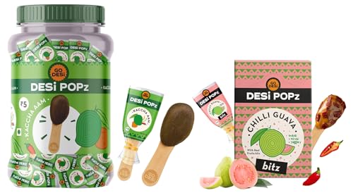 GO DESi Popz Kaccha Aam | 100 Pieces | Aam Candy | Fruit Snacks | Sour Candies | Lollipop | Raw Mango CandyLollipop with a desi twist. Made with real-kaccha aam jaggery and Indian spices it is the perfect mixture of sweet sour and spice.GO DESi POPz with Bitz | Chilli Guava | 50 Pcs | Fruit Snacks 400 gmYour favourite DESi lollipops just got bigger and better with the new DESi POPz with Bits- Chilli Guava: A spicy-sweet lollipop featuring a classic DESi combo- Ripe pink guavas and Chilli. What's more every bite hides a special surprise- real guava pieces!!!